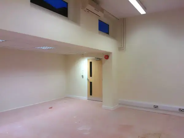 Electrical work included repositioning and addition of lighting along with fire alarms and new data trunking. The removal of the internal corridor wall was made good and re-plastered along with the old external entrance doors.